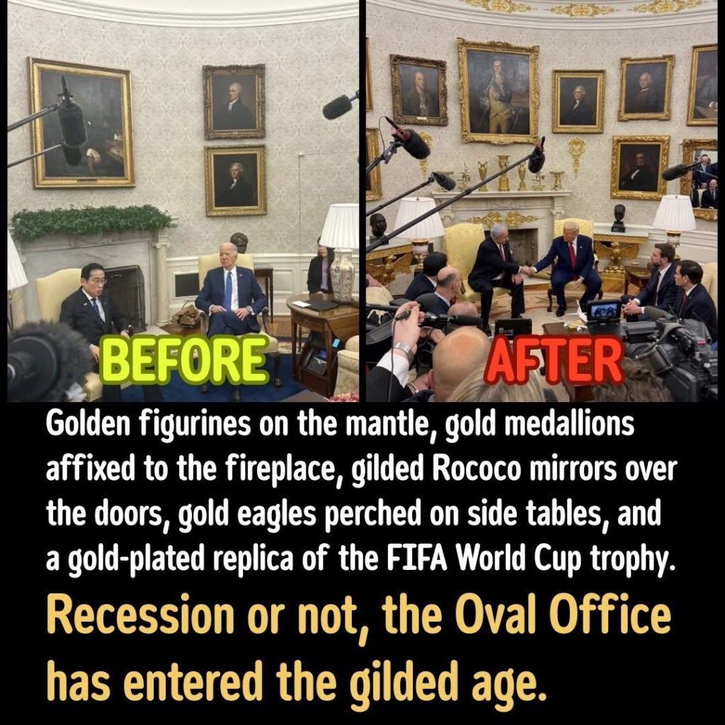 He is trying to drive us back to the Gilded Age. Just look at pix of what he did to the Oval Office. The tacky gold stuff is just appalling.