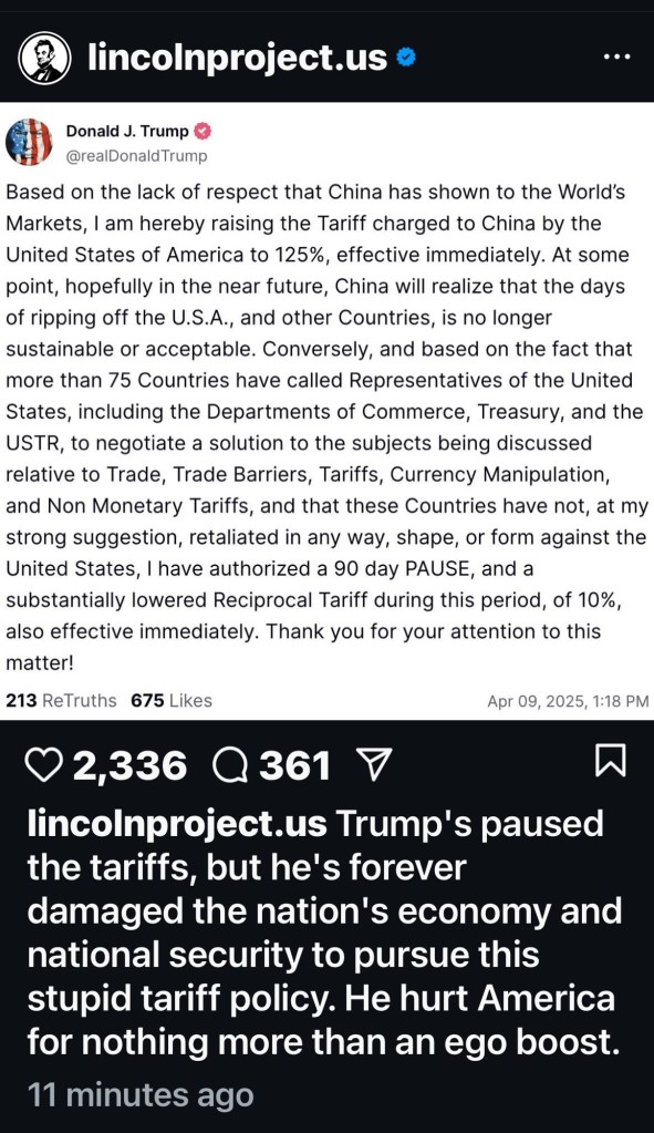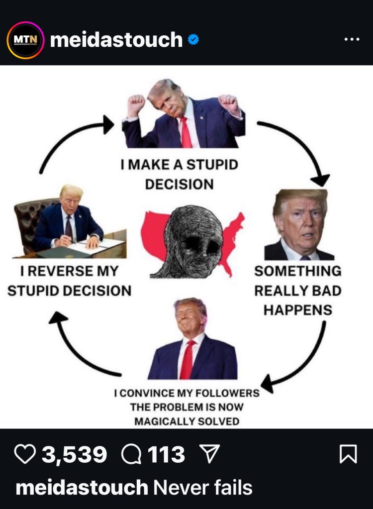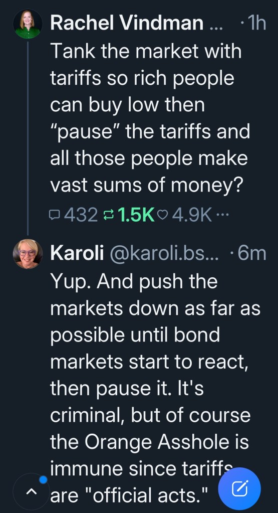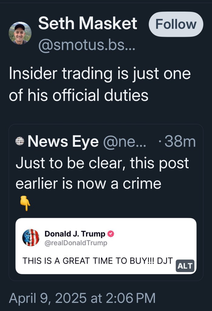 Trump tells his followers to buy stock in the morning, minutes after the market opens, then announces he is pausing tariffs 4 hours later.Nothing to see here.