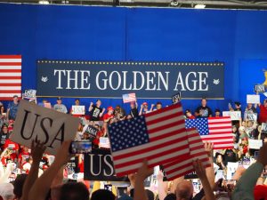 But surrounded by signs that declared this “THE GOLDEN AGE” at Macomb Community College in Warren, Michigan, Trump – and his supporters – were ebullient.