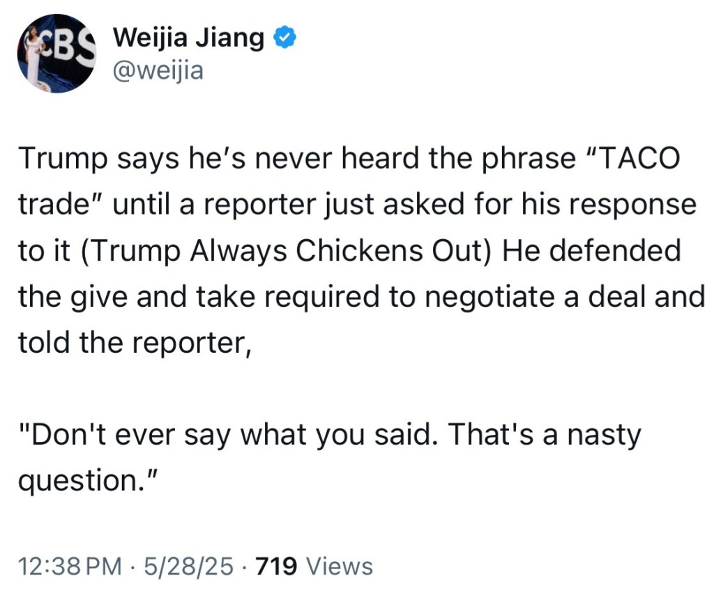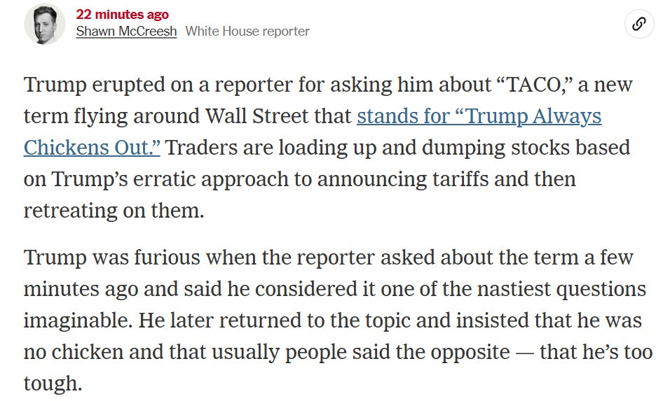Trump gets asked about Wall Street’s “TACO trade” philosophy (“Trump Always Chickens Out”) on his tariffs. Needless to say, he did not appreciate the question.