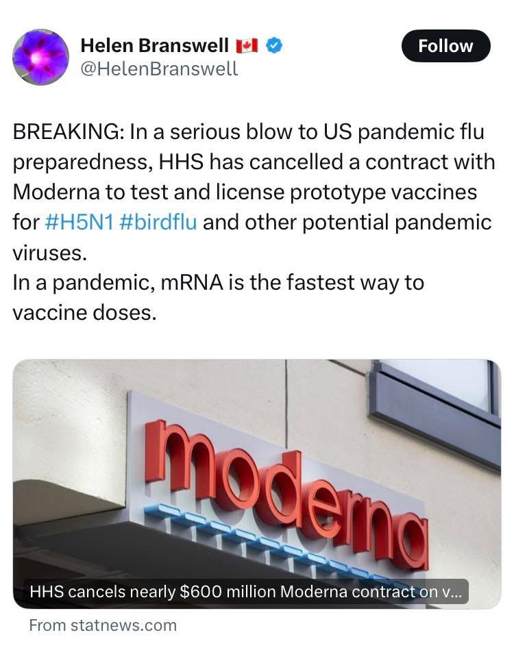 HHS, led by anti-vaxxer RFK Jr., just canceled a $766 million contract with Moderna to fight potential pandemic flu viruses, including the H5N1 bird flu.Moderna had just announced positive interim results from an early-stage trial of the vaccine. http://www.huffpost.com/entry/flu-va...