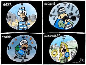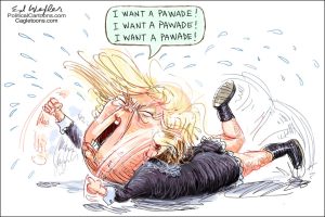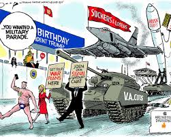 I’m not sure if I should laugh or cry about that. The interesting thing today is that the headlines are all about the real events in the world, like Israel Bombing Iran and Iran attacking back. L.A. is still on the front pages, and Kristi Noem, the psycho puppy killer. The only place you’ll find the parade is in the political cartoons.