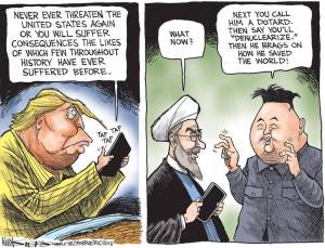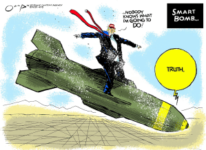 The Guardian has a headline today that’s spot on. George Bush got led on by his own advisors. Trump’s advisors said no to the mission. Evidently, Trump was taken by strongman Benjamin Netanyahoo! After all that speechifying about Hillary getting us into another World War and how he’d never drag us into something like Dubya did to Iraq and Afghanistan. Here we are. “Like George W Bush, Trump has started a reckless war based on a lie. The Iraq War was built on a lie. Now history is repeating itself.”  Mohamad Bazzi has the analysis.