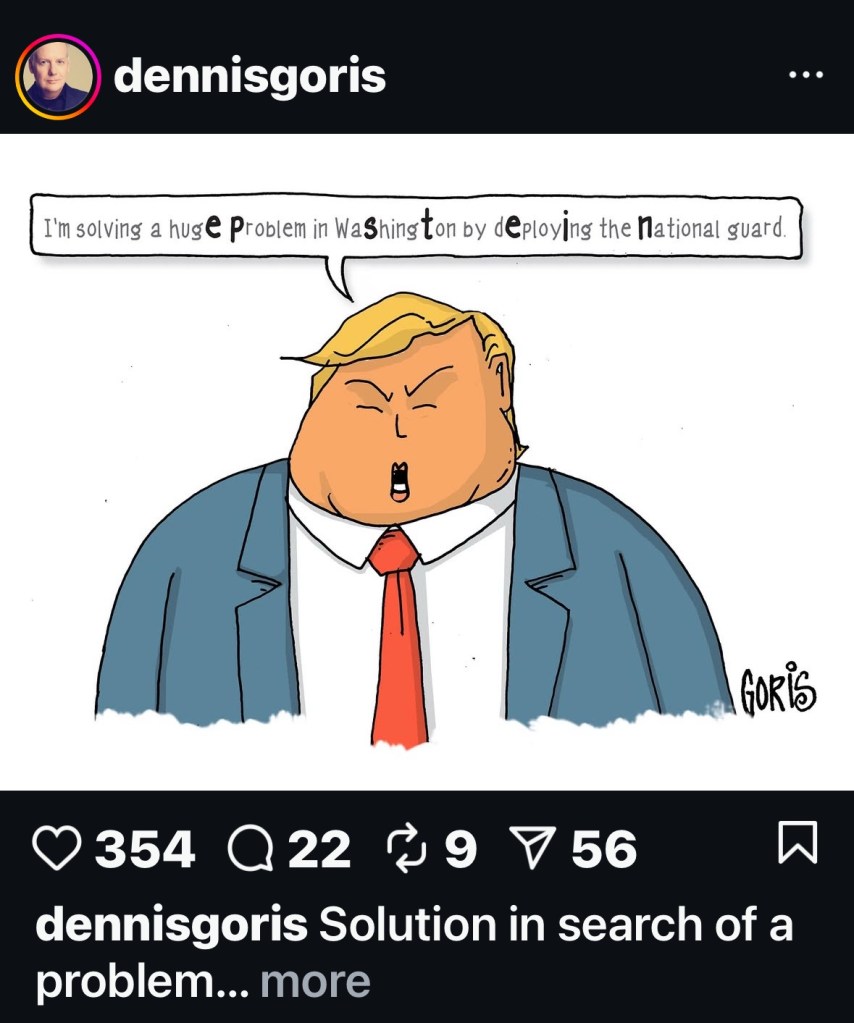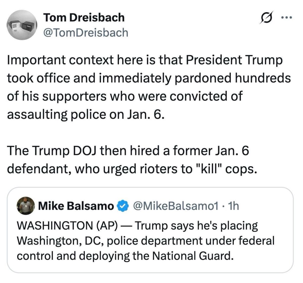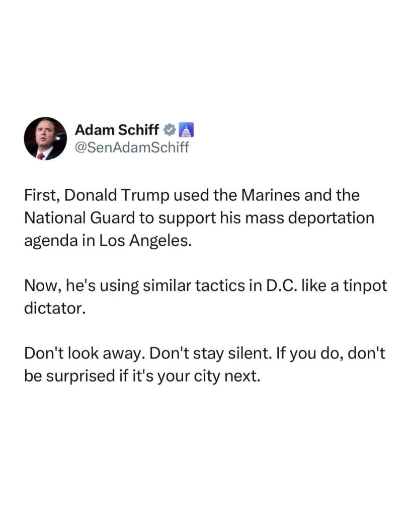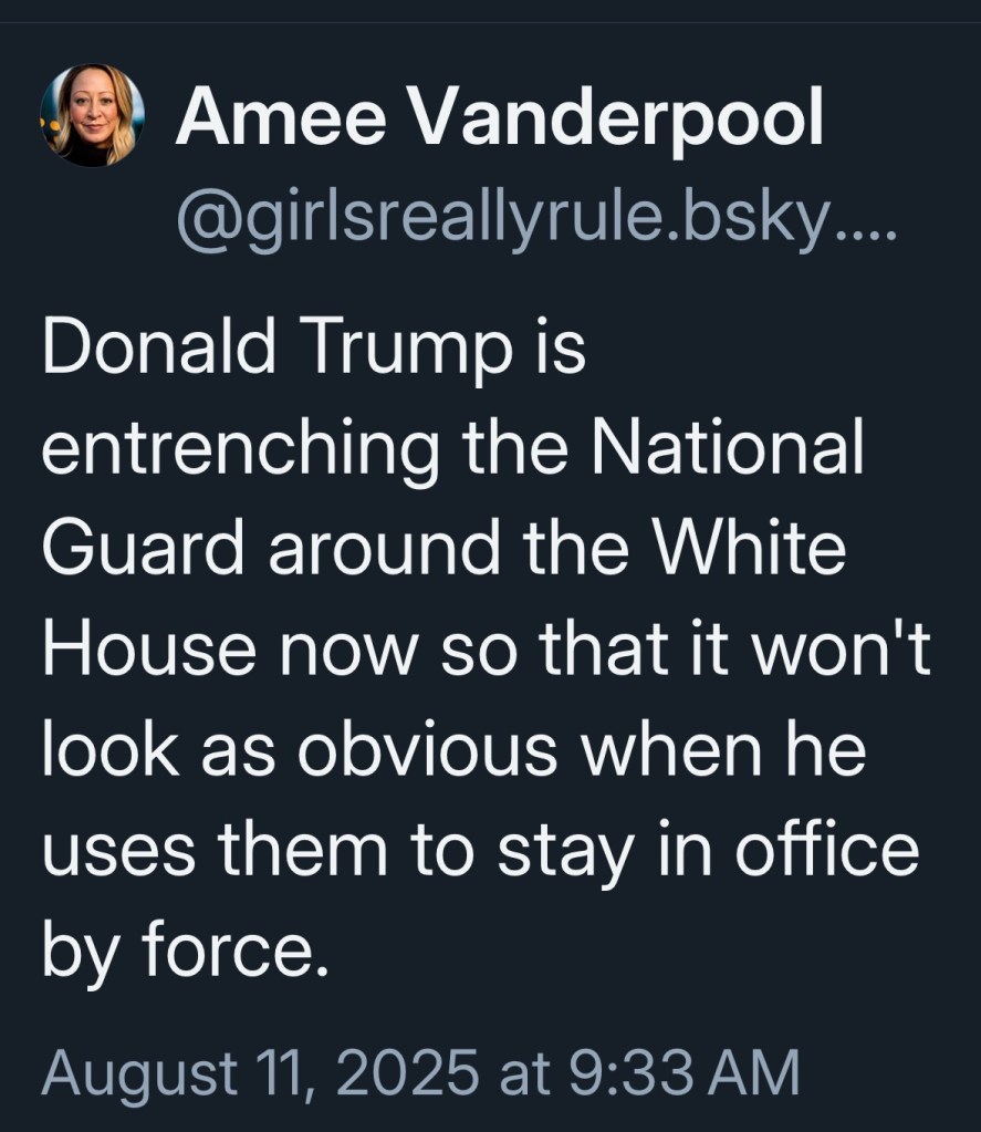 All this use of military and the Guard in L.A. and D.C. are just a little too much Reichstag fire for me. He’s been talking about sending the Guard and military to other places too. I’m waiting for him to declare martial law frankly, because I think that next level of power grabbing is coming. He hates all of us in big blue cities.