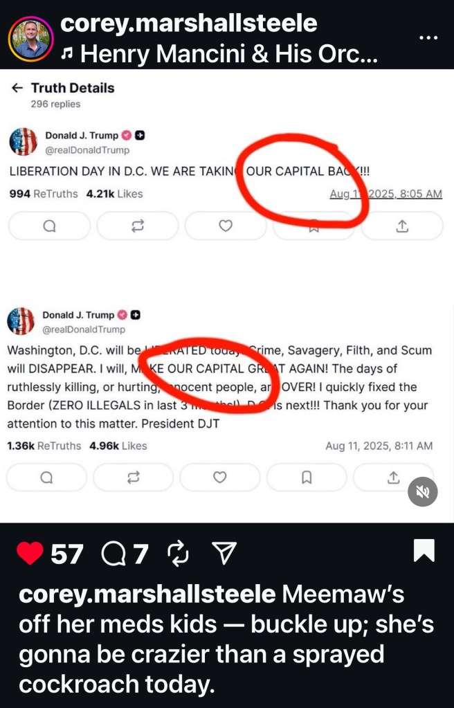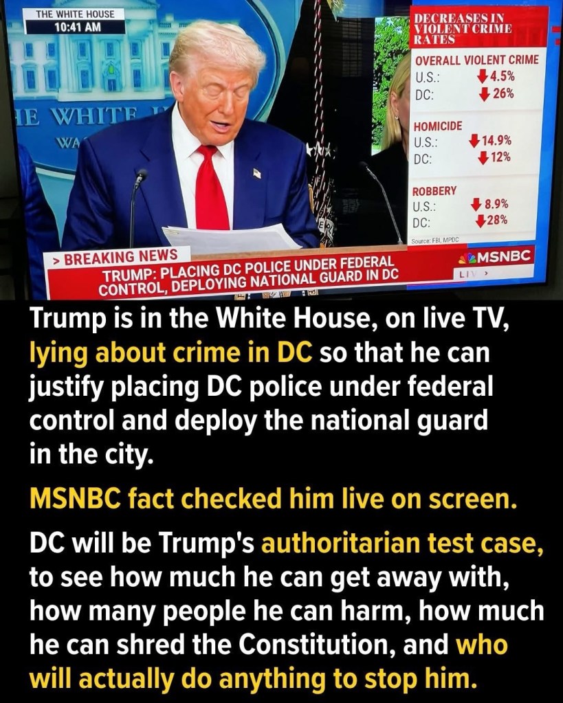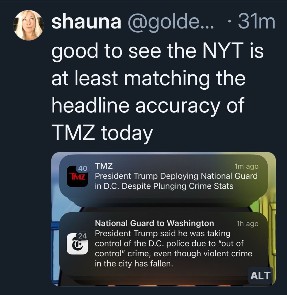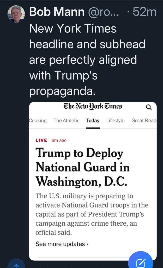 All this use of military and the Guard in L.A. and D.C. are just a little too much Reichstag fire for me. He’s been talking about sending the Guard and military to other places too. I’m waiting for him to declare martial law frankly, because I think that next level of power grabbing is coming. He hates all of us in big blue cities.