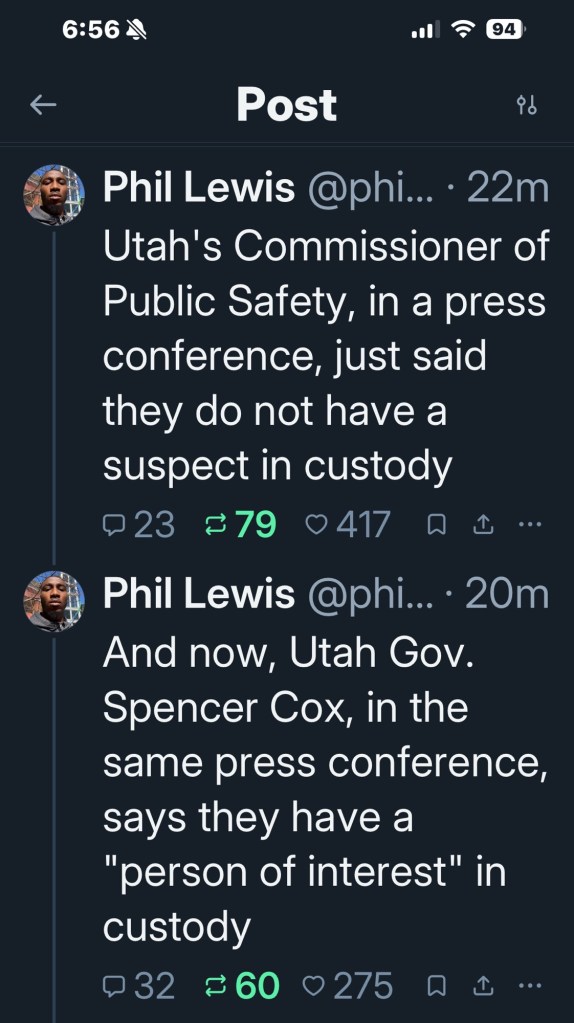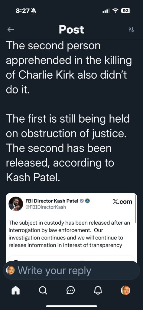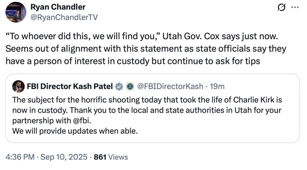 BREAKING The killer of Charlie Kirk remains at large. FBI Director Kash Patel just now: “The subject in custody has been released after an interrogation by law enforcement. Our investigation continues and we will continue to release information in interest of transparency.”
