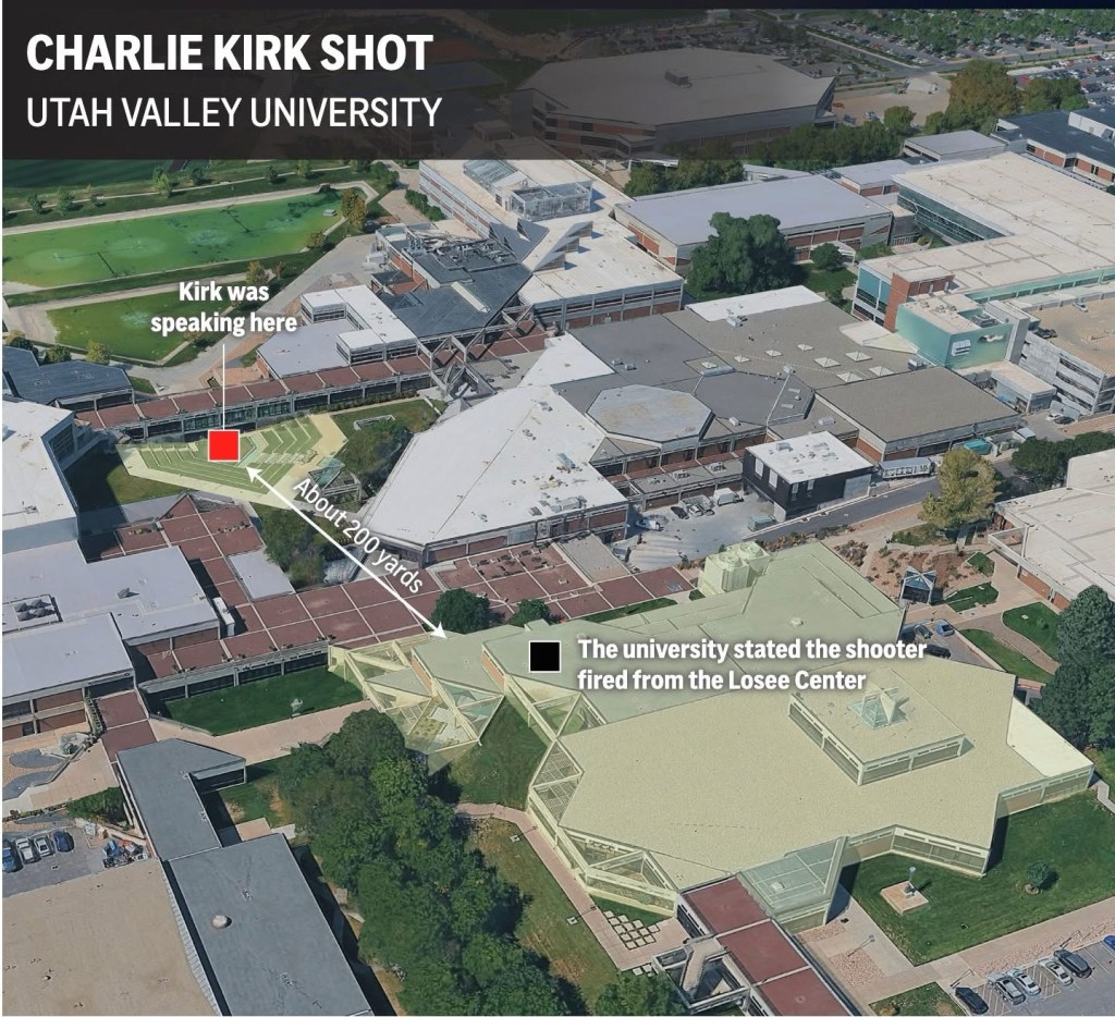 The university spokeswoman, Ellen Treanor, said that Mr. Kirk was struck about 20 minutes after he began speaking on campus. She said a suspect had fired at Mr. Kirk from the Losee Center, a building about 200 yards away, and been taken into custody. The suspect was not a student, she said.