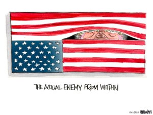 Trump’s speech was largely incoherent and included many of his familiar gripes, but its basic purpose came through loud and clear. He doesn’t believe the U.S. military should be dealing with foreign threats. Instead, he plans to use active duty military troops to police the U.S. Southern border and also to attack “the enemy within”–protesters in Democratic U.S. cities.