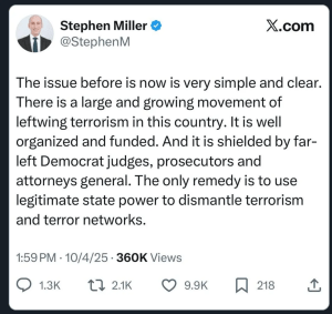 Posted: October 6, 2025 Filed under: USA State Terrorism | Tags: Attacks on judges, Bad Bunny, ICE Law suits, Steven Miller demon, Trump State Terrorism 4 Comments