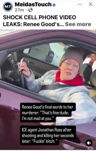 So in Trump’s mind, Renee Nicole Good’s murder is at most collateral damage, in service to his insatiable need to dominate and feel powerful — so insatiable that he is attempting to create an alternate reality, claiming that that Good ran over an agent although there is irrefutable video evidence that she didn’t.