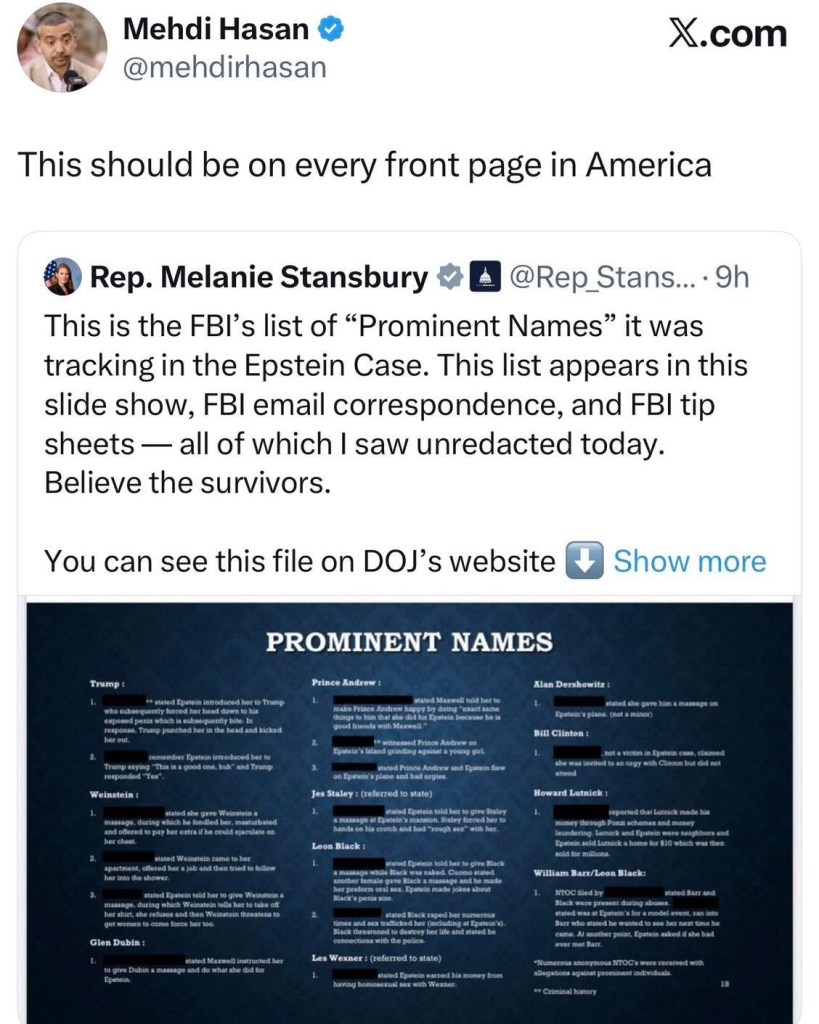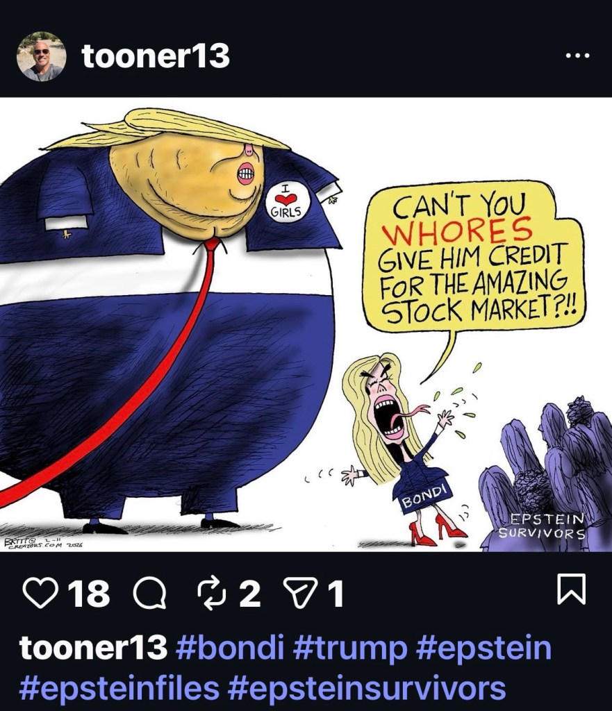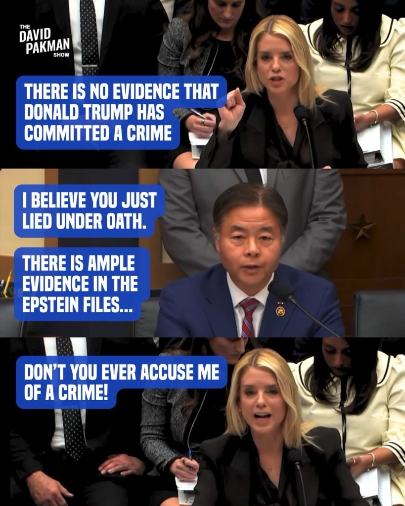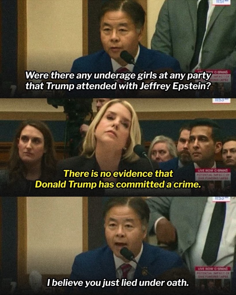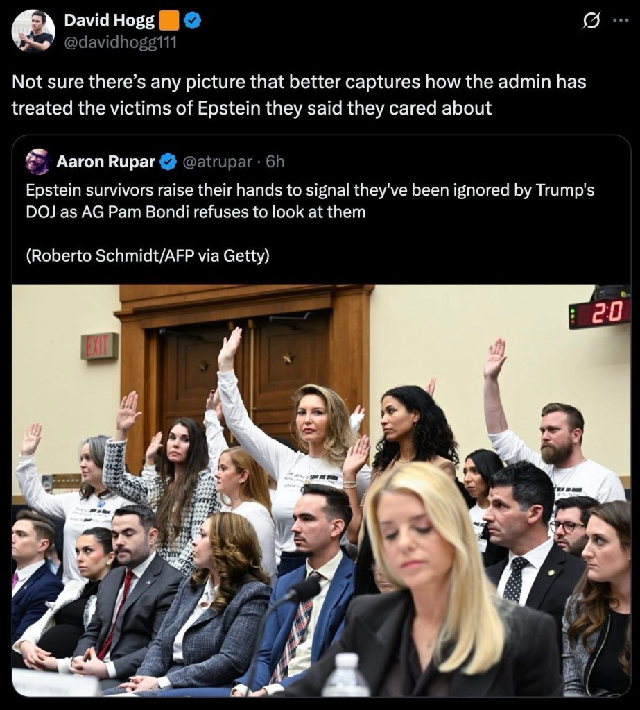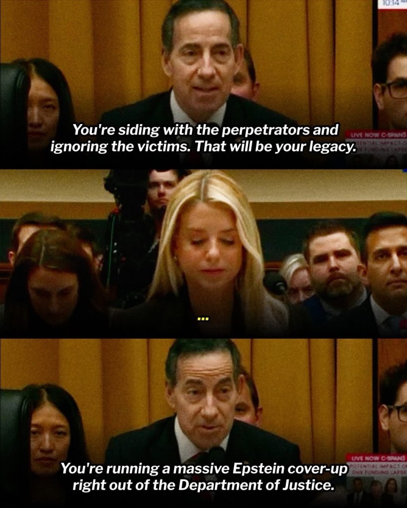 Pam Bondi has been a complete and total failure at her job. The Epstein survivors showed more courage just by being in that room than she did under oath. She refused to answer questions and chose complicity. America deserves better.