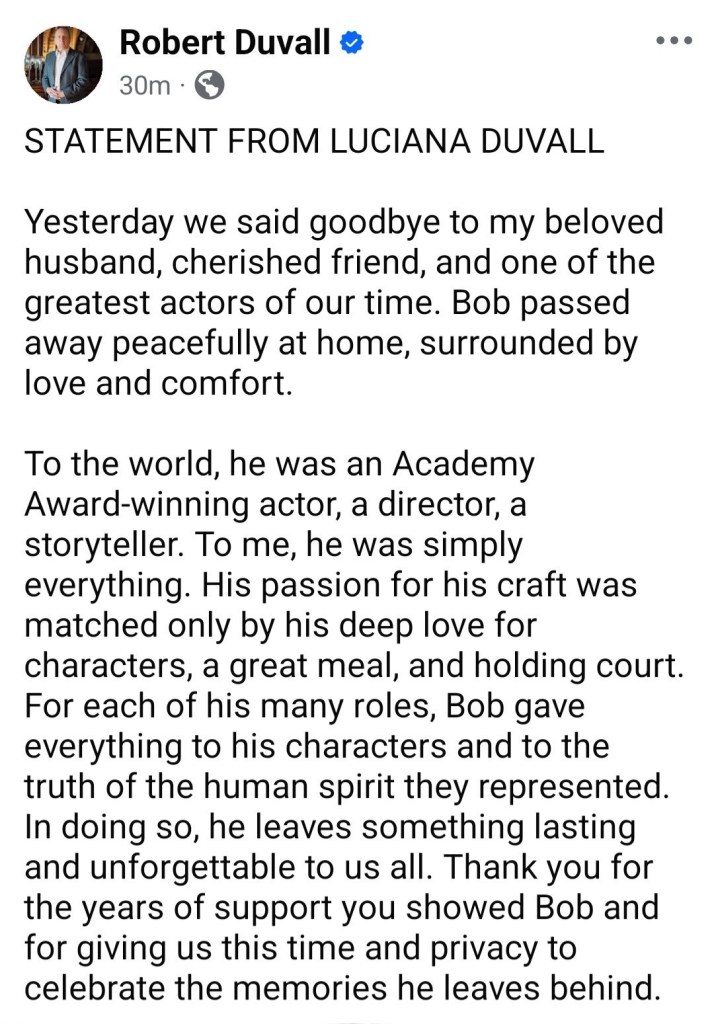 What a joy to say I lived my life when Robert Duvall was performing his art…the man was truly an amazing actor.