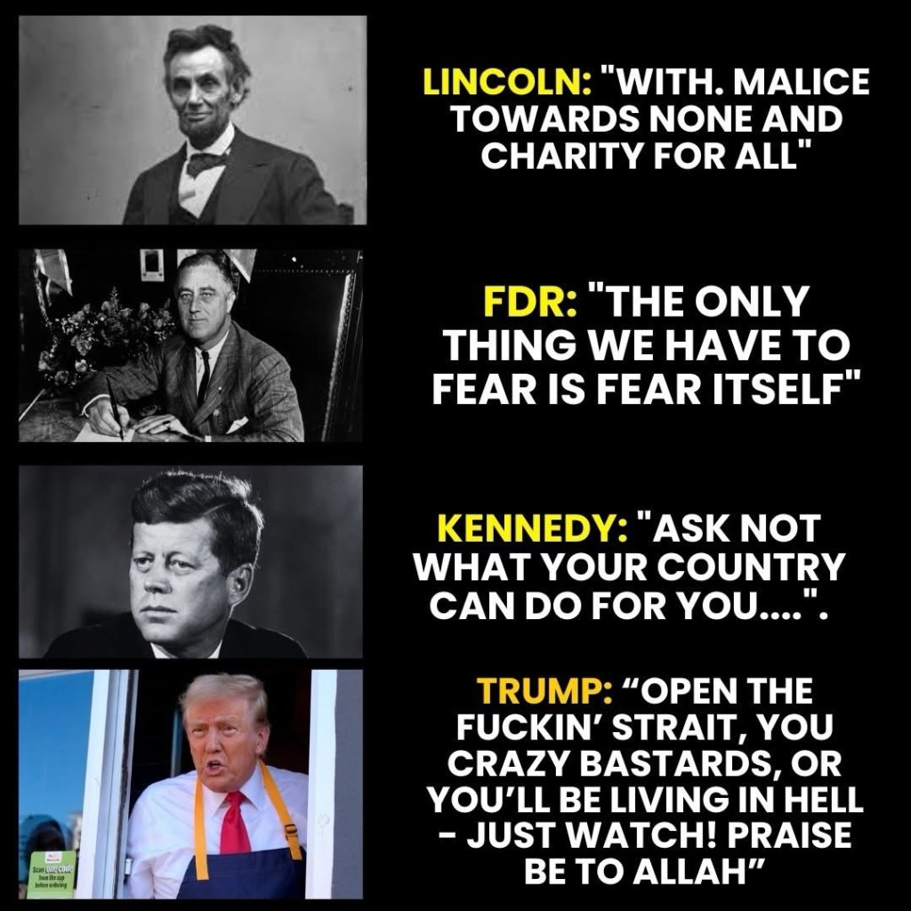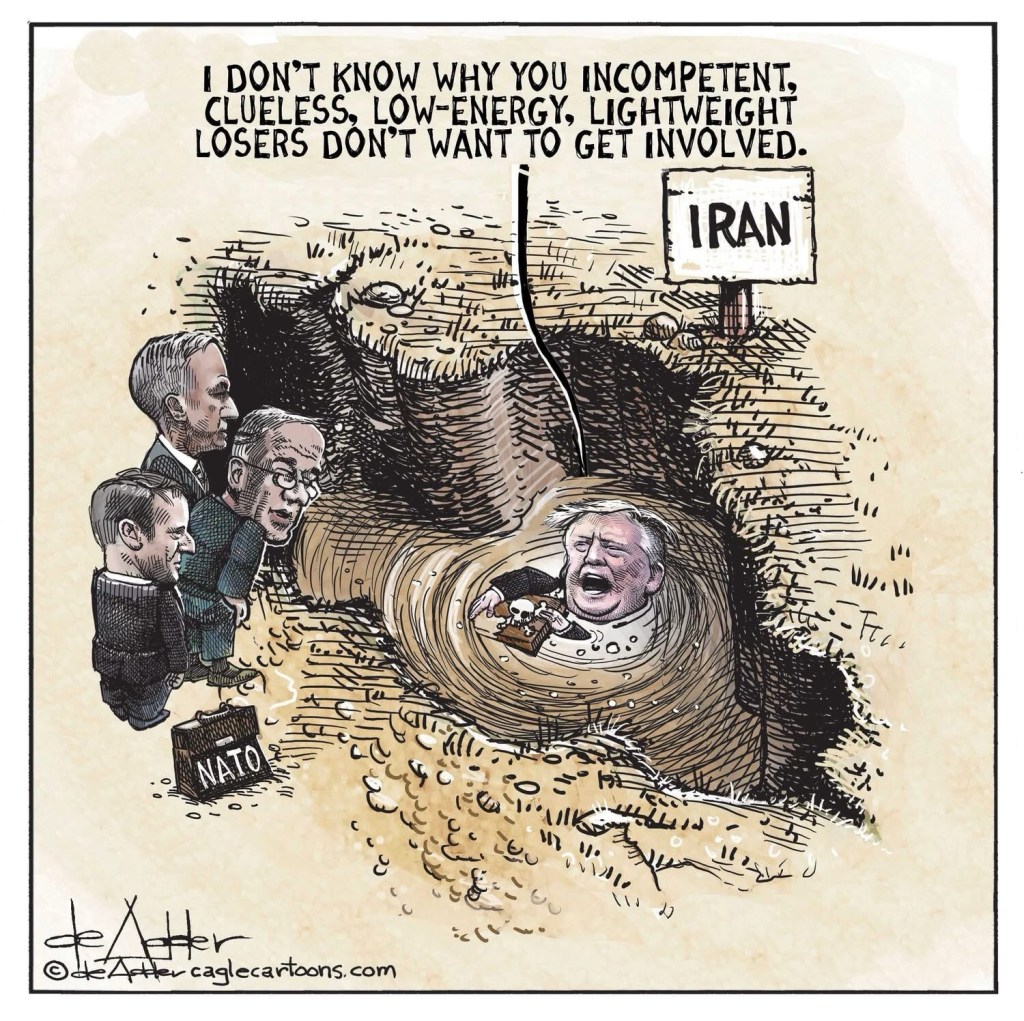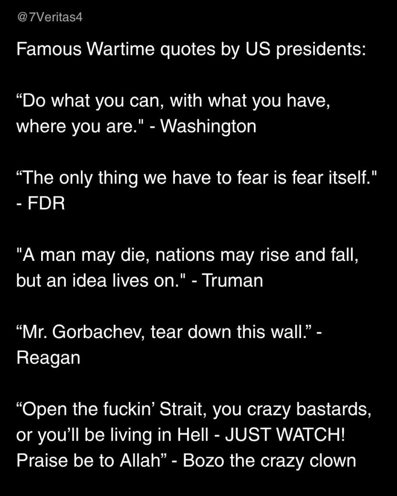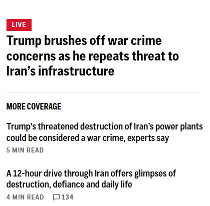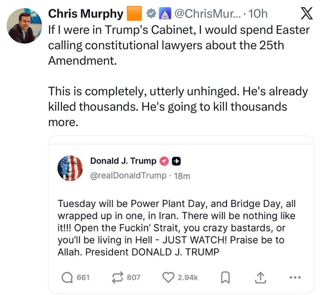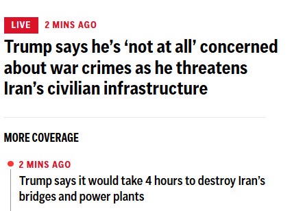 Trump's latest ravings:- Wants the USA to charge ships for permission to transit the Strait of Hormuz- Would like to seize Iran's oil- Threatens to destroy every power plant in Iran on Tuesday night- Says feud with NATO started because they refused to give him Greenland