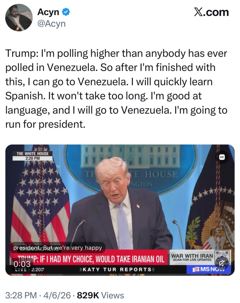Trump: After I'm finished with this, I can go to Venezuela. I will quickly learn Spanish. It won't take too long. I'm good at language, and I will go to Venezuela. I'm gonna run for president.
