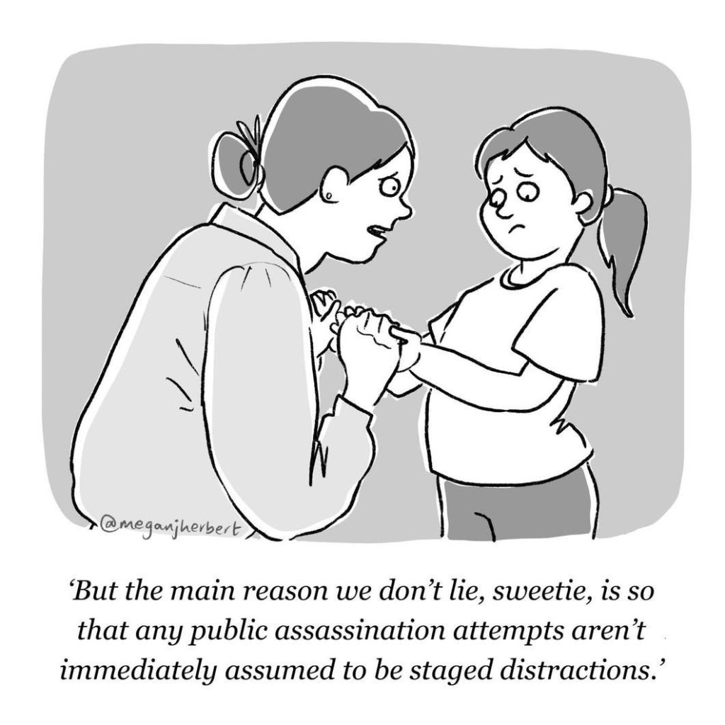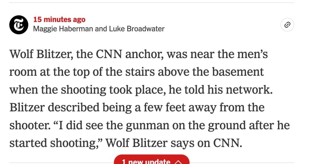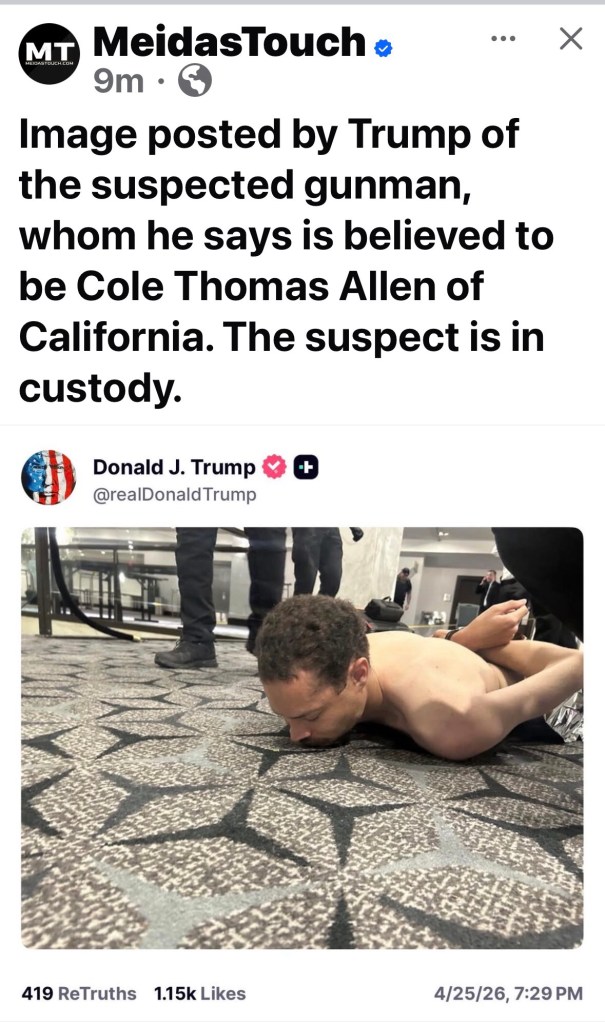Shots fired, the Secret Service rushes in, and they let Trump continue to sit there? And now they’re going to resume the White House Correspondents’ Dinner, and Trump still plans to deliver a speech?I’m not saying this was staged to boost Trump’s tanking approval numbers, but it looks odd.