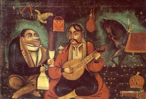 Cossack Mamay is tempted to drink by the Polish-looking Satan, Ukrainian folk art,