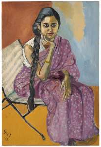 Alice Neel’s 1966 painting of a South Asian woman, her mauve sari covered with periwinkle diamonds, is among two dozen portraits in the show “Alice Neel, Uptown” at David Zwirner gallery.