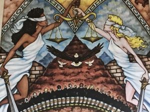 Justice is Blind. This mural was created by Ronald McDowell, who was commissioned by Jefferson County Court House, Birmingham, Alabama. 2018