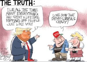 In Donald Trump’s imaginary world, Americans can’t venture out to buy a loaf of bread without getting shot, mugged or raped. Immigrants in a small Ohio town eat their neighbors’ cats and dogs. World War III and economic collapse are just around the corner. And kids head off to school only to return at day’s end having undergone gender reassignment surgery.