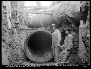 I can only think about these pipes being formed in someplace where there were thousands of real steelers working up North. They were likely put on trains that could reach a place where they could be floated on barges to their home down here. That pipe was at least 20 feet underground and was large enough for a good-sized man to crawl through it using hands and knees. I’m now curious about what kind of cranes they had back in the day because that pipe likely weighed a lot. So, think back to those years where the dawn of the last century met science, technology, and progress. That picture of pipes placed in Boston in 1909 looked a lot like the one they pulled out of the cross street on my block.