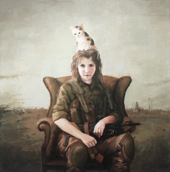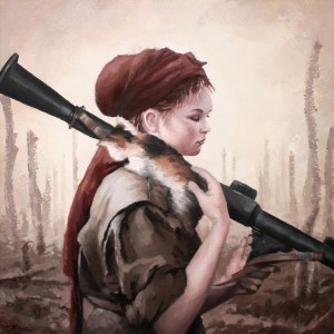 “Don’t scare, it’s me.” The girl and the cat have been closed for a while. “Come here. Let’s find something for you.” The cat let her hold it up and lied on her shoulder. “What were you looking for? Birds? Mice?” They couldn’t find anything. The area wasn’t just no man’s land. It should be no life’s land. “Well, do you eat bugs? I don’t think so.” The cat jumped off her shoulder and started rummaging dead bodies. “No, you don’t eat human flesh. No way.” “See what you found. Beef jerky! You scared me.” Gray Zao, “Girl Soldier holding an RPC and a cat on her shoulder” from the Collection “Women, Guns, Oil Paintings”