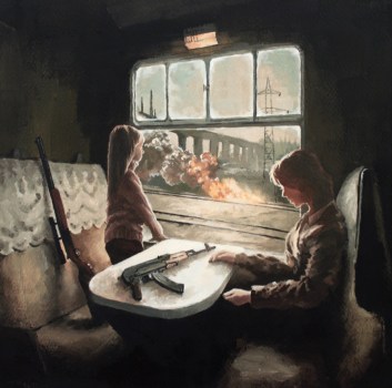 ““Can I sit next to you?” Said the girl. “What? Who are you?” Said the woman. “I don’t know. A girl?” “How old are you?” “6, I guess.” “Oh, you’re a war baby.” “What’s that?” “You’re born and have lived your whole life in wartime.” “Are you a war baby, too?” “No.” “You’re a peace baby?” “Y…Yes. Everyone used to be a peace baby.” “What’s peace like?” “It’s like…um..normal?” “War is normal.” “Oh… Then peace is the opposite of normal.” “Like having a family?” “Yes… Hey, you need a mom?” Gray Zao, “Train Trip” from the collection “Women, Guns, Oil Paintings”