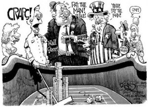 We all recall the ‘taxation without representation’ line from our school years, stemming from the passage of the Stamp Act in the 1760s and later the Tea Act in 1773. King George had debts to pay off—a Seven Year’s War among other things. And the East India Company’s tea pitched into the Boston Harbor? East India was basically provided a monopoly on tea shipped into the colonies. The company [and its aristocratic shareholders] were none too happy about their profits pinched and drowned in the harbor and helped push [lobby] the King to pass the Coercive Acts, aka The Intolerable Acts. The colonists were generally peeved at the British Parliament for taxing them without their consent and then adding insult to injury, giving the East India Co. a cushy, duty-free export to undercut colonial merchants. But they were beyond peeved when punitive measures were leveled. They demanded that Parliament end its corrupt economic policies with and stop the bailout of that era’s own TBTF East India Company.