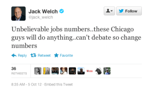 1) Minutes after the report was released, Jack Welch, who famously cooked General Electric’s accounting books when he was CEO, accused President Obama of manipulating the numbers to distract from his debate performance.