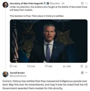 This has particular meaning to me. I’ve visited the Wounded Knee site many times. I was there, in 1974, when Russell Means ( Waŋblí Ohítika) and Lakota activists took over the Nebraska State Capitol. I spent time at the encampments and heard many stories of the horrible treatment of the indigenous people. I cannot believe we’re totally reversing history, where this massacre is once again a monument to white colonialism and racism. This is from The Independent. “Pete Hegseth says Wounded Knee veterans will be allowed to keep their medals. Secretary of War rules that U.S. troops who received America’s highest military honor for their part in the explosion of violence in which hundreds of Lakota Sioux were killed can hold onto their accolades.”What’s next? Statues of Custer everywhere?