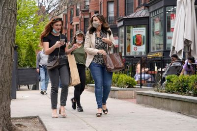 People on Newbury Street in the Boston MA area still wearing maks despite the lifting of outdoors masking requirements around Memorial day.