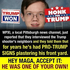 There’s no way to blame Biden for the shooter, given his personal history as a gun-toting right-wing Republican, either. “FBI probing motives, the background of Thomas Matthew Crooks, the Western Pa. gunman behind Donald Trump assassination attempt. Former classmates described Crooks as politically conservative and a “loner.” Authorities believe the AR-15-style rifle he used belonged to his father.” This is from the Philadelphia Inquirer,