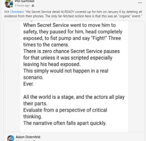 One of the most questionable things is that photos of Trump show him looking in the direction of the building where the shooter was. This is precisely when he turned his head to point to his whiteboard. At that point, local police went to the roof, saw him, and went back down the stairs. There was also a hesitation by the Secret Service Sniper to shoot him. Acyn, the Senior Digital Editor for MeidasTouch.com, captured this on CSPN. He’s looking directly at the shooter and then angling towards the White Board. The shooter was only about 165ish feet away from Donald. That’s definitely a distance that a good sniper could handle.