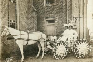 Martha Yates Jones (left) and Pinkie Yates (right), daughters of Rev. Jack Yates, in a decorated carriage parked in front of the Antioch Baptist Church located in Houston’s Fourth Ward, 1908 — Source