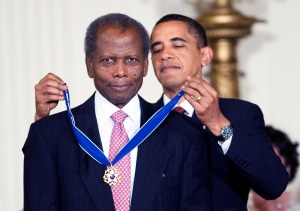 US President Barack Obama awards American actor Sidney Poitier the 2009 Presidential Medal of Freedom, America’s highest civilian honor, during a ceremony in the East Room of the White House in Washington, DC, USA, on 12 August 2009.