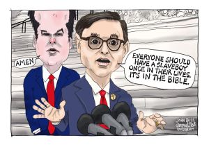 In particular, Johnson is deep in the Christofascist derp. And if you didn’t know that already, it became clear last Thursday during his first big TV interview as speaker, a spot on Sean Hannity’s show where he explained that his position on any issue comes straight from the Bible.