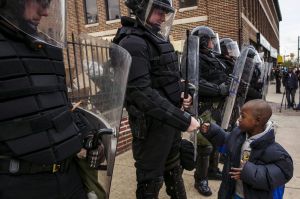 This is a peaceful protest with police presence. A young boy greets police officers in riot gear during a march in Maryland. (LUCAS JACKSON/REUTERS)