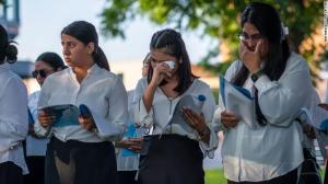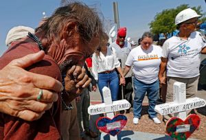 A woman reacts as she pays her respects at a memorial site for the victims killed in this week’s elementary school shooting in Uvalde, Texas, Thursday, May 26, 2022. (AP Photo/Dario Lopez-Mills)