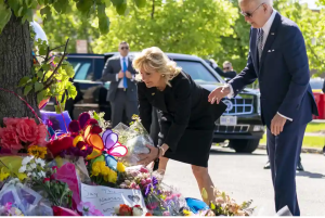 Joe Biden and the first lady, Jill Biden, pay their respects to the victims of Saturday’s shooting at a memorial across the street from the Tops Market in Buffalo. Photograph: Andrew Harnik/AP