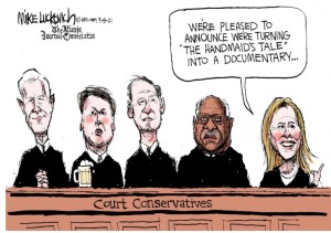 Well, it’s my turn to grieve with our community as our democracy turns to rule by reactionary theocrats. Both Lady Liberty and Blind Justice are women. Both will be less than second-class citizens soon by the pen of angry white men and a Hand Maid. Theocratic fascists on the Supreme Court-appointed by Republican Presidents who did not win a majority vote are taking down the rights of the majority of citizens and doing so without the consent of the governed.