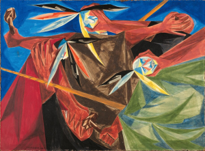 “Rally Mohawks! Bring out your axes, and tell King George we’ll pay no taxes on his foreign tea . . . — a song of 1773,” Panel 3 (1955) from “Struggle: From the History of the American People” (1954–56), by Jacob Lawrence.