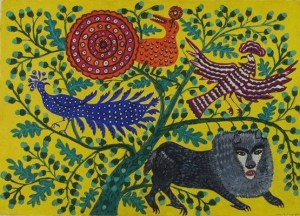 Around 1936, Tetiana Floru, an artist from Kyiv, saw Prymachenko’s embroideries for sale in the Ivankiv market and invited her to join the Central Experimental Workshop of the Kyiv Museum of Ukrainian Art, an assembly of folk artists from all over the country. It was life-changing for Prymachenko, who in Kyiv underwent surgeries for complications from childhood polio that finally allowed her to walk. In 1936, her works were included in the First Republican Folk Art Exhibition in Kyiv, which later traveled to Moscow and Leningrad, and the following year some of her drawings were presented in the International Exhibition in Paris, where she received a gold medal and the blurb of a lifetime from Pablo Picasso….