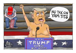 Trump’s running mate has been fishing in these waters for several years and now trails a train of cringe-worthy quotations he must own. JD Vance chose to unburden himself to Tucker Carlson. “We’re effectively run in this country, via the Democrats, via our corporate oligarchs, by a bunch of childless cat ladies who are miserable at their own lives and the choices that they’ve made. And so they wanna make the rest of the country miserable, too.” He then name-checked Harris, Pete Buttigieg and Alexandria Ocasio-Cortez.