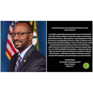 Kenner Councilman Gregory Carroll responded to the memo in a public Facebook post Sunday (Sept. 9), “I was not made aware of this decision beforehand and it is in direct contradiction of what I stand for and what the City of Kenner should stand for. I am 100% AGAINST this decision. I will meet with the Mayor and other Council members in an effort to rescind this directive.”