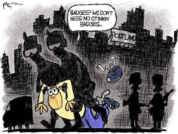 Last week, people wearing combat fatigues were seen pulling apparently peaceful protesters off the streets of Portland, Oregon, and hustling them into unmarked vehicles. Their uniforms carried no identifying insignia, but they were clearly military uniforms. Based on the video evidence so far, the people being arrested were not engaged in crime. So we are faced with two questions. First, are these people military personnel, or are they police officers dressed up like soldiers? Second, do these people have the authority to sweep people off the street like this?