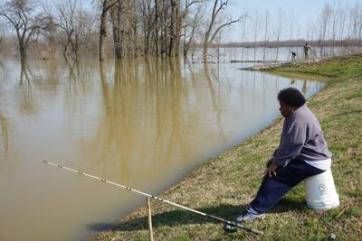 Delores Griffin fishes in a flooded Ohio River at Fort Defiance State Park in Cairo earlier this month.