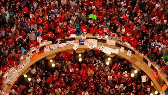 the Republicans to start the process of gutting the right to organize and form collective bargaining units for state employees like teachers and police. All 14 of the Democratic senators have actually left the state. The State Patrol has been sent to fetch them by State Senate President. Most people guess they’ve fled to Illinois somewhere as a group.