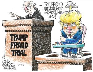 Media outlets are already taking notice of Biden’s ads and the basic look of Trump in Court. So are Political Cartoonists! This is from The Guardian. “Video released of petulant Trump in civil fraud trial deposition. Smirking, pouting and defiant ex-president bragged about properties and claimed he prevented nuclear war with North Korea.”
