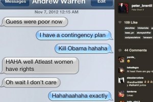In a series of text messages to his friend Andrew Warren, which were reprinted by Jezebel, Warren whined about how a second Obama term would make him “poor.” Brant II then claimed, “I have a contingency plan. Kill Obama hahaha.”