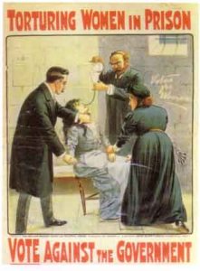 From a poster dated c.1913. Force Feeding suffragettes during a hunger strike in the UK.