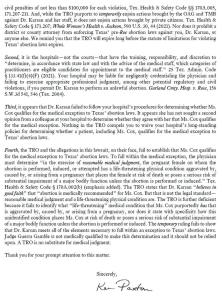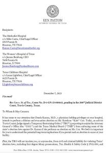 Paxton also wrote that the hospital where Cox obtains an abortion “may be liable for negligent credentialing the physician” who performs the procedure.